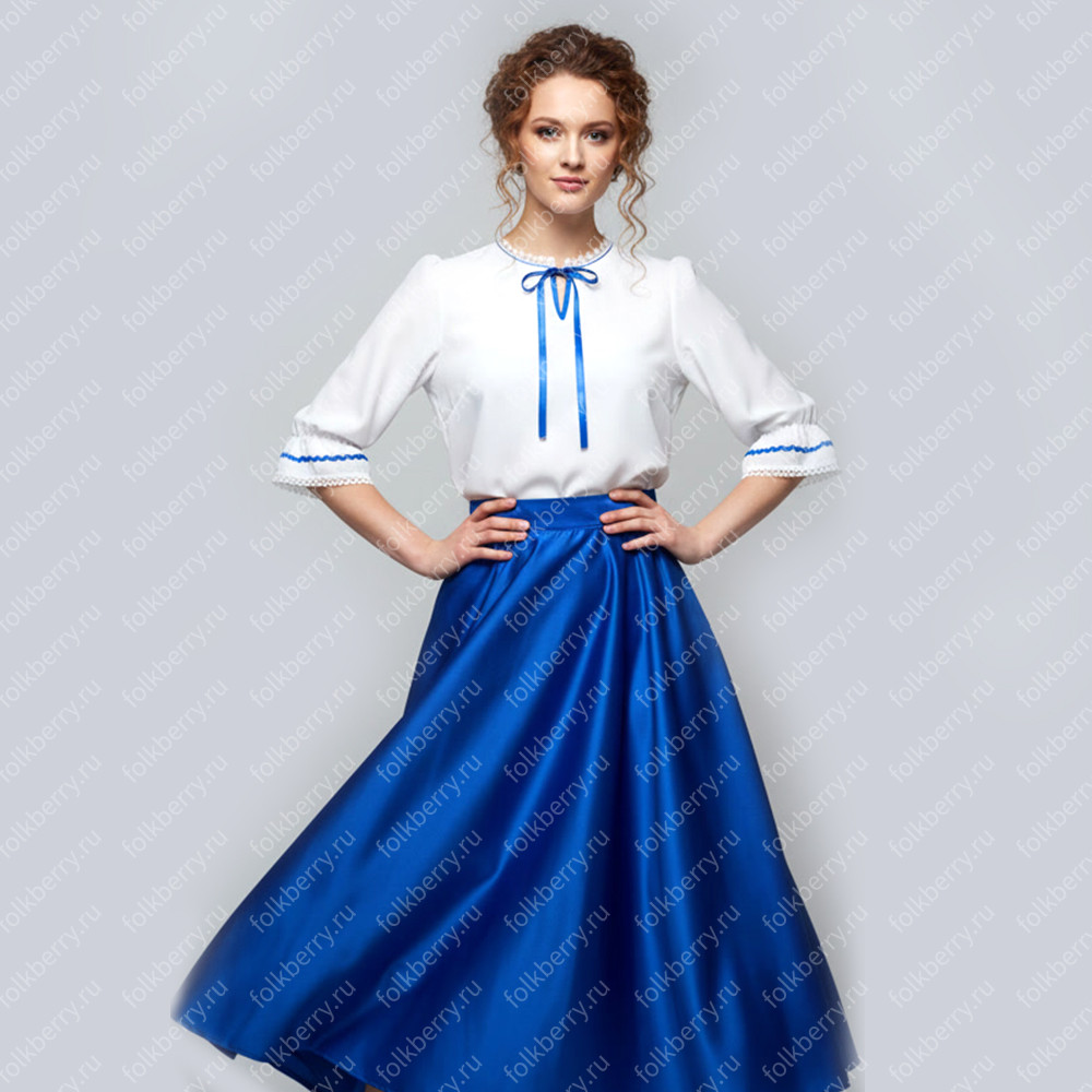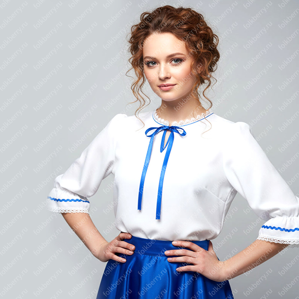Блуза выполнена из белого шифона. Пышный рукав, по запястью  волан.  Декор золотистого или серебристого цвета.