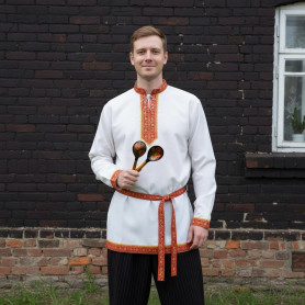 Фасон рубахи удобен и  не ограничивает движения. Жесткий воротник, пуговицы отсутствуют, рукав втачной, немного спущенный, свободный, длина рукава примерно до локтя. По бокам внизу разрезы. К рубахе прилагается пояс. Декор на груди выполнен из жаккардовой тесьмы в натуральном цвете. Для подбора правильного размера, в заказе, пожалуйста, пишите рост, обхват груди и талии.