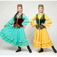 Приталенная модель хорошо сидит по фигуре, расклешенная книзу дает крупные мягкие волны. Сзади расположена застежка «молния». Талия дополнительно подчеркивается поясом. Плечики регулируются по длине. Сарафан украшен широкой полосой из жаккардовой тесьмы, вьюнка, золотистого шнура, кружева.