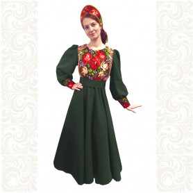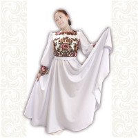 Характерное отличие юбки от любой другой в том, что она обычно изготавливается из трех кусков ткани прямоугольной формы, собранных на общем поясе. Понева выполнена изо льна черного цвета. Каждая часть поневы декорирована жаккардовой тесьмой и вьюнами внизу и по примеру. Примечательно, что широкая тесьма с цветочным узором, выполнена на основе исторического изображения, см. фото. Как правило, поневу надевают на длинную рубаху и подпоясывают тканым славянским поясом или поясом-шнурком.