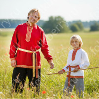 Косоворотка украшена жаккардовой тесьмой и вьюнком, контрастирующей по цвету с основной тканью. В комплекте с изделием идет кушак.