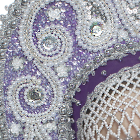 Кокошник выполнен из бархата (или атласа, на Ваш выбор), бусин белого и золотого цвета, пайеток, жаккардовой тесьмы, контрастной по цвету к фону.
