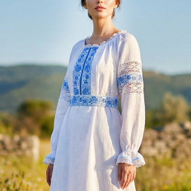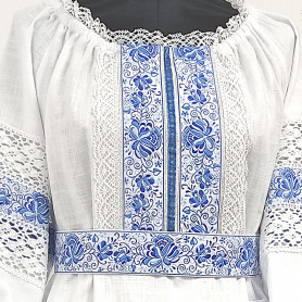 Костюм  выполнен из габардина и красиво подобранного декора в золотистых цветах. Достоинства габардина  в том, что он не мнется, не блестит, как атлас, ложится красивыми  мягкими складками, цвет не выгорает. Юбка  с оборкой, декор в золотистых цветах, по талии на  двойной резинке. Блуза  белого праздничного цвета, с баской,  рукава расширены внизу, с манжетами.   Сзади на блузе шнуровка. Она дает хорошую посадку по фигуре. Костюм предназначен для творческих  сольных и коллективных театральных выступлений.
