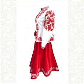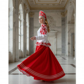 Выполненный в православном стиле сарафан с блузой «Дуняша» сшит из натурального хлопка в цветочек. Модель скромно декорирована однотонным воланом в цвет с основной тканью и тесьмой вьюнок. Можно носить под пояс и регулировать бретели по длине. Белая блузка из хлопка с длинным рукавом расшита натуральным нежным кружевом.