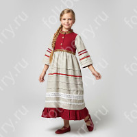 Костюм выполнен из парчи бело-серебристого цвета. Костюм декорирован искусственным мехом белого цвета. Застежка - потайные кнопки. Силуэт - приталенный, сзади кулиска для регулировки талии. Красивый пышный рукав. Отделка - серебристая ажурная тесьма. Длина шубки по спинке 93-98 см (от седьмого шейного позвонка до низа изделия).