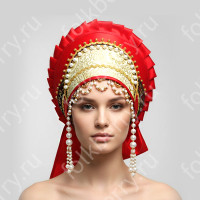Костюм  выполнен из габардина и красиво подобранного декора в золотистых цветах. Достоинства габардина  в том, что он не мнется, не блестит, как атлас, ложится красивыми  мягкими складками, цвет не выгорает. Юбка  с оборкой, декор в золотистых цветах, по талии на  двойной резинке. Блуза  белого праздничного цвета, с баской,  рукава расширены внизу, с манжетами.   Сзади на блузе шнуровка. Она дает хорошую посадку по фигуре. Костюм предназначен для творческих  сольных и коллективных театральных выступлений.