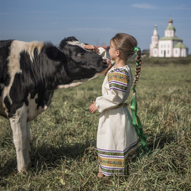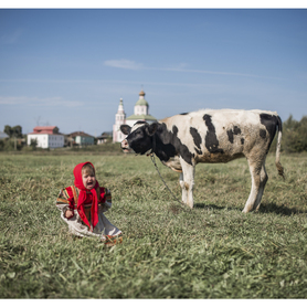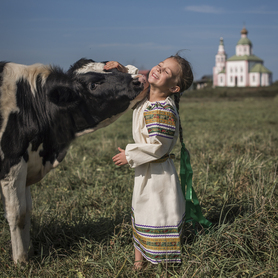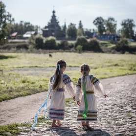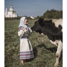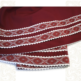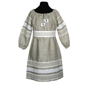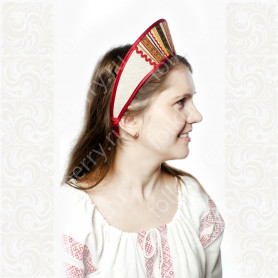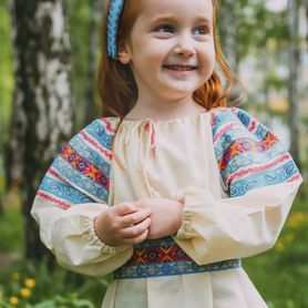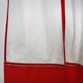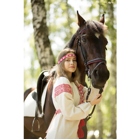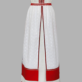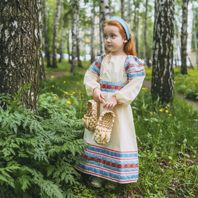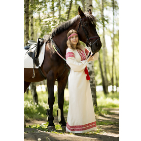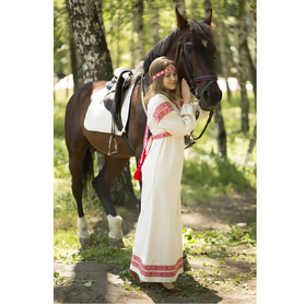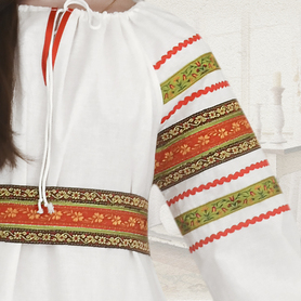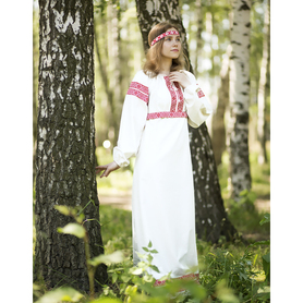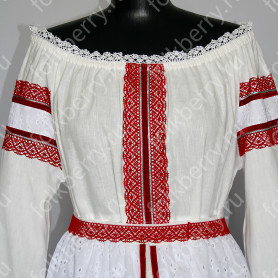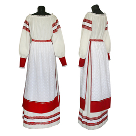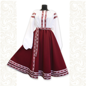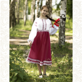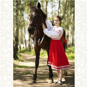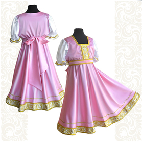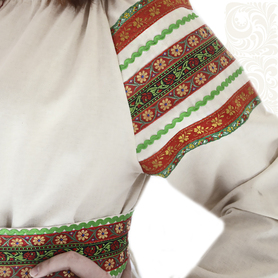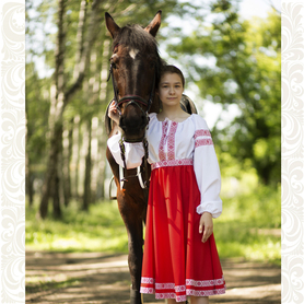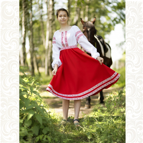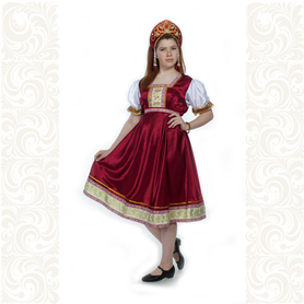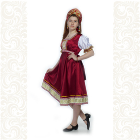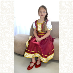 Платье сшито из яркого красного атласа и декорировано вставками с рисунком «хохлома». Юбка фасон полтора «солнца», подол и горловина украшены белым кружевом и тесьмой. Рукава «фонарики» сделаны из легкой, белой органзы.