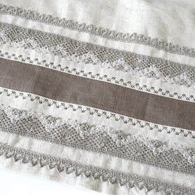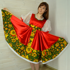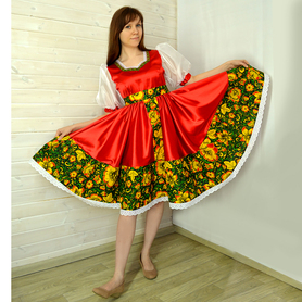 Материалы: стрейч-атлас синего цвета, лен или габардин с рисунком «Гжель», кружево.