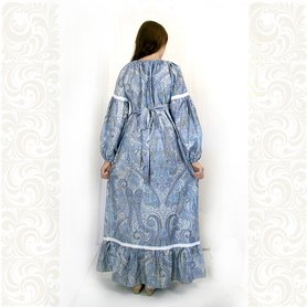 Платье «Гжель» приятного и благородного синего цвета с выразительным декором на основе гжельской росписи.