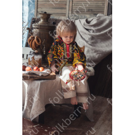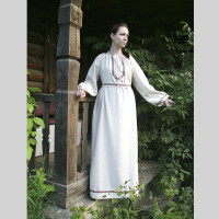 Платье «Полюшко» выполнено в традиционном фольклорном стиле. Для пошива использована льняная ткань (светло-серая небеленая или белая). Изделие декорировано несколькими видами жаккардовой тесьмы, которая складывается в красивые широкие lдекоративные бордюры на рукавах, по низу, на талии.