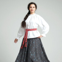 Декор платья - жаккардовая тесьма со славянскими символами. Талия немного завышена, пояс в комплекте.