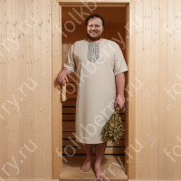 Платье изготовлено из умягченного белого льна и украшено жаккардовой тесьмой с узорами Гжель и  белым кружевом разной ширины, а также бархоткой и  изысканной серебристой тонкой тесьмой. Платье силуэта А, расклешено к низу. В комплект входит  пояс с веревочками на концах. Рукава - удобный реглан, также декорированы кружевом и  жаккардовой тесьмой. Платье немного просвечивает, желательно надевать с легким подъюбником или юбкой-поневой.