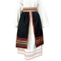Эта традиционная женская рубаха ( длинная туника с поликами под мышками, с разрезами по бокам, с поясом) из белого льна декорирована по низу рукава, подолу и на груди широкой жаккардовой тесьмой со славянскими обережными символами красного цвета на белом фоне.