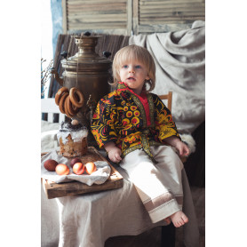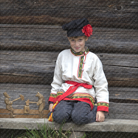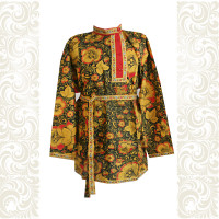 Мужская рубаха «Истоки» выполнена из хбелого льна, имеет втачной рукав. По низу изделия, вороту и рукавам расположена жаккардовая тесьма с обережным рисунком. Дополняет рубаху кушак (пояс) из ткани с тесьмой.