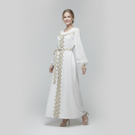 Длинное платье с рукавами выполнено из качественной комфортной парчи благородного золотого цвета и парчи-компаньена с цветочным принтом.