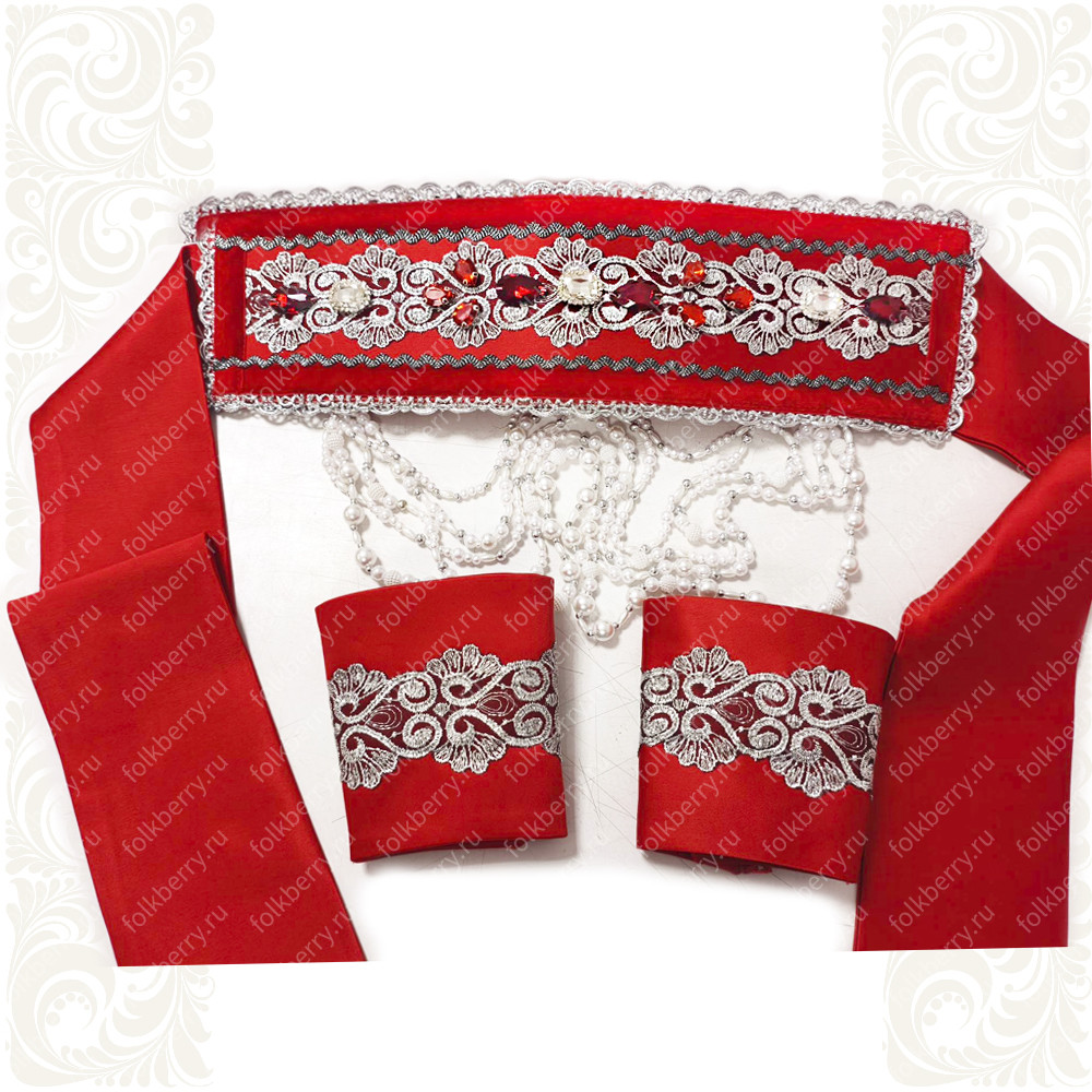 2. Оплечье (съемный круглый плоско лежащий воротник); украшено вологодским кружевом, бусинами, стеклянными стразами рубинового и кремового цвета цвета.