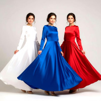 Костюм  выполнен из габардина и красиво подобранного декора в золотистых цветах. Достоинства габардина  в том, что он не мнется, не блестит, как атлас, ложится красивыми  мягкими складками, цвет не выгорает. Юбка  с оборкой, декор в золотистых цветах, по талии на  двойной резинке. Блуза  белого праздничного цвета, с баской,  рукава расширены внизу, с манжетами.   Сзади на блузе шнуровка. Она дает хорошую посадку по фигуре. Костюм предназначен для творческих  сольных и коллективных театральных выступлений.